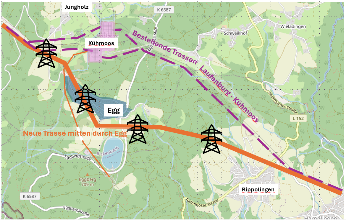 Warum sollte transnetBW dann eine Trasse mitten durch einen Wohnort neu bauen dürfen unter Missachtung jeglicher Mindestabstände? Warum werden im Gutachten zum Immissionschutz mögliche Verbesserungsmaßnahmen mit nicht nachvollziehbaren Begründungen abgelehnt? - Das Bundesnaturschutzgesetz schreibt auch vor, dass die Zerschneidung und die Inanspruchnahme der Landschaft so gering wie möglich gehalten wird. Würde transnetBW die vorhandene Trasse weiter nördlich nutzen oder ausbauen, wie es der Bürgerverein Egg schon vor Jahren vorgeschlagen hat, dann könnte die Trasse nach Egg abgebaut werden und die Zerschneidung der Landschaft wäre geringer. Warum sollte der Neubau der Trasse durch Egg genehmigt werden, wenn trasnnetBW eine sinnvolle Alternative und für den Naturschutz bessere Lösung noch nicht einmal geprüft hat?